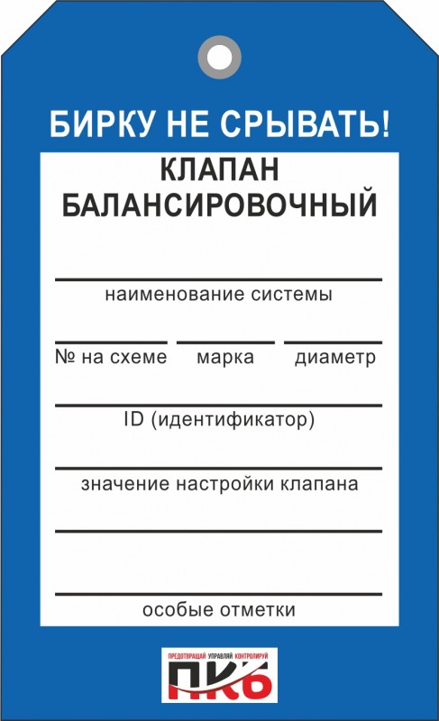 Информационная бирка "Клапан балансировочный". Изготовлена из пластика ПВХ, толщиной 0,3 мм, без ламинации, диаметр отверстия 7 мм. По желанию заказчика толщина бирки может быть увеличена до 1-2 мм. Нанесение текста необходимо производить маркером или шариковой ручкой. Размер 70 х 115 х 0,3 мм.